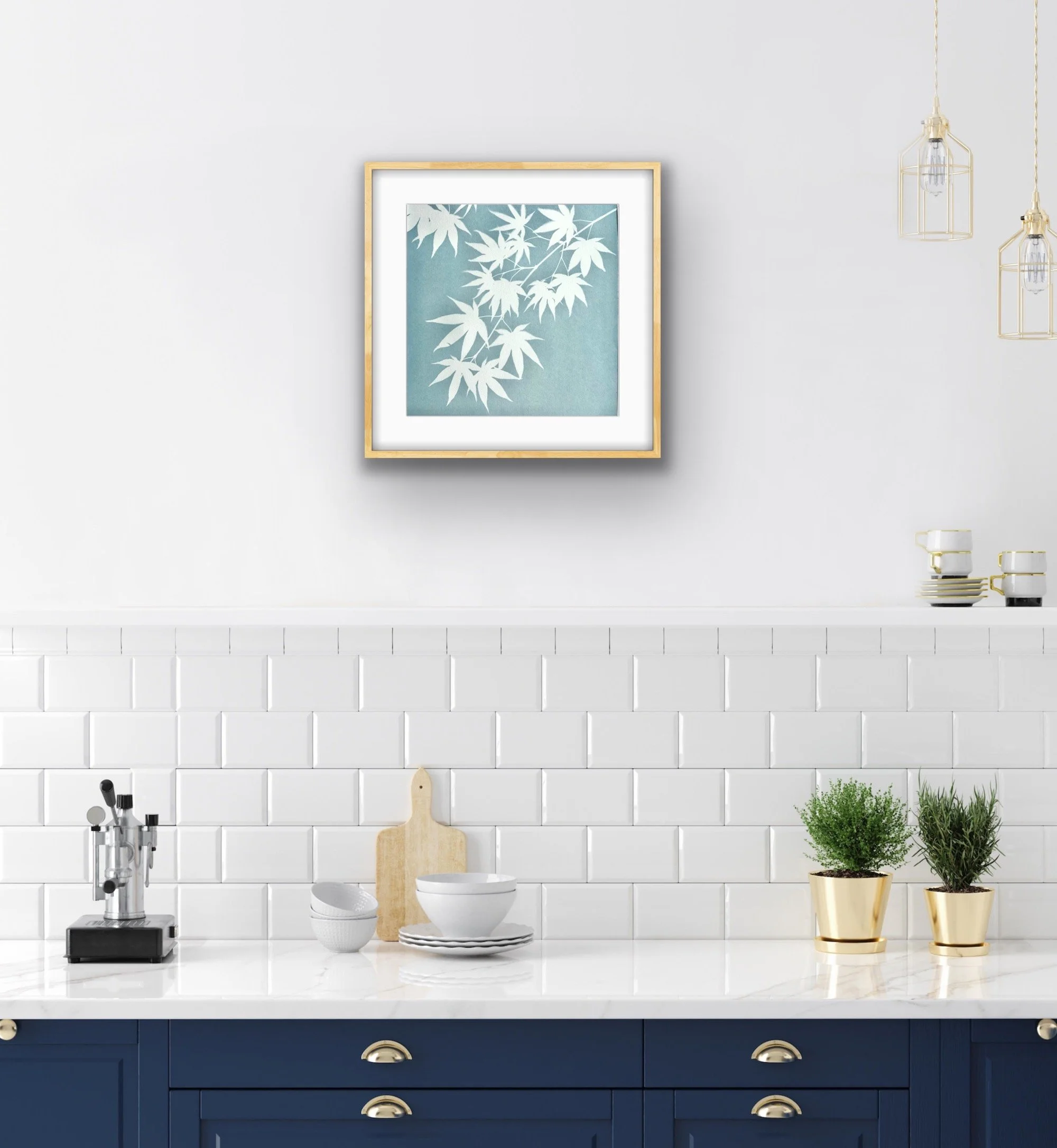 This is a very difficult color to achieve with the cyanotype process, a bluish-gray and cream combination. It’s best seen in person. The gray is soft a cool slate gray and the leaves are a warm pale cream rather than cold white. That is because cotton watercolor paper is a warm ivory color and not super white.