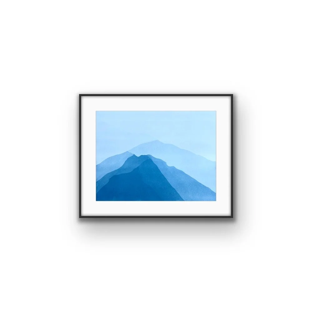 Though these monotypes resemble watercolor paintings or an aquatint etchings, they are actually a form of photography called a cyanotype, photogram or sun print. What you see is a multiple-exposure lensless photograph. Each is entirely unique. These exact lines, shapes and shades of blue cannot be recreated as the exposure of the paper was heavily manipulated by me during each printing.