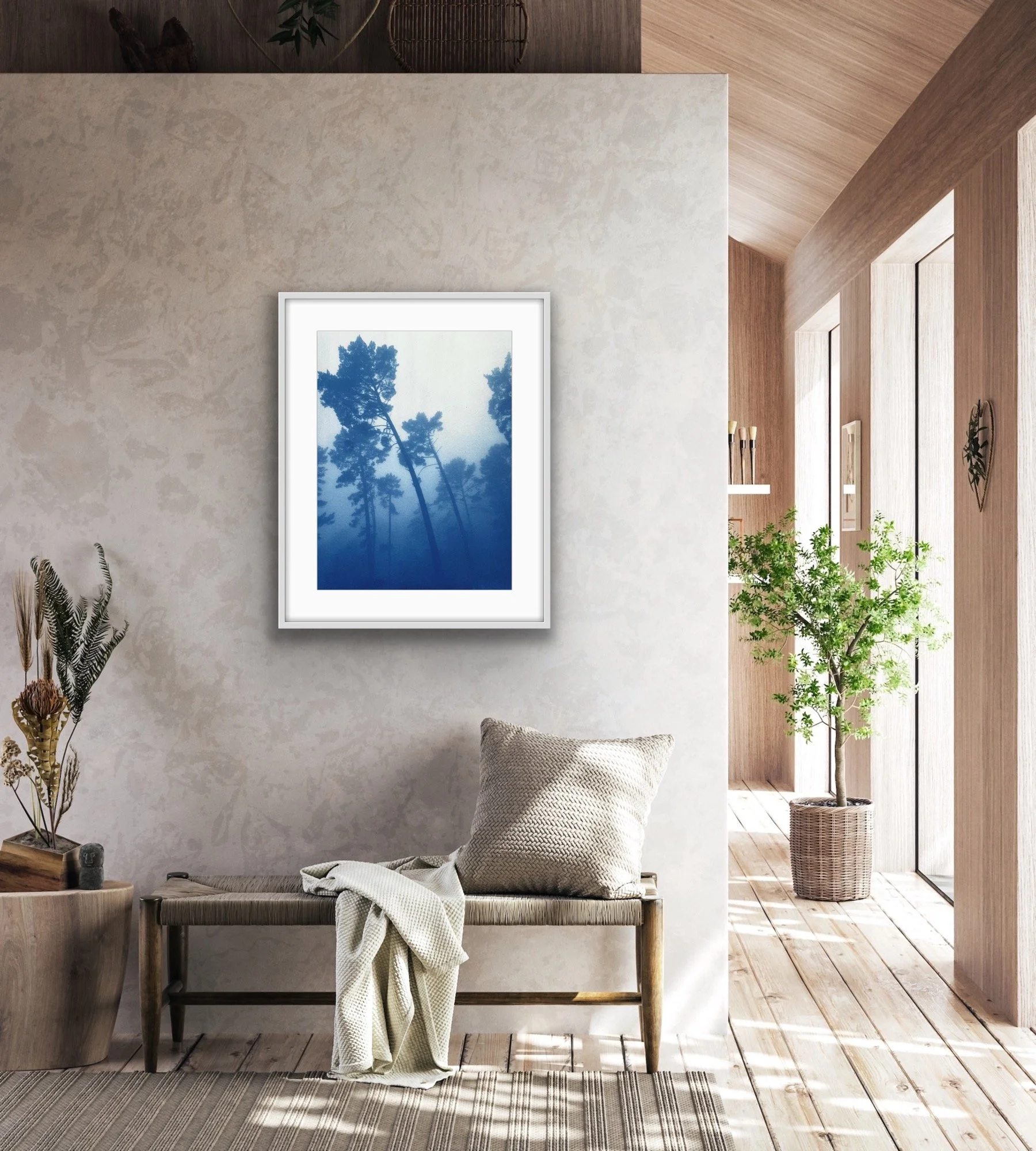 The paper is a heavy 100% cotton watercolor paper. Slight variations of shades of blue exist from print to print as each sheet of paper was hand-painted with photo chemicals in the dark and printed in natural sunlight with variations in the weather and intensity of light causing some prints to be darker than others.