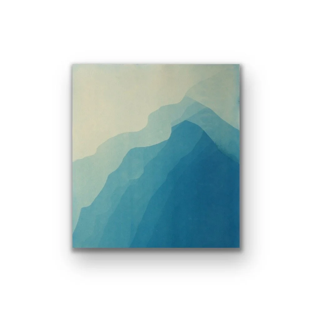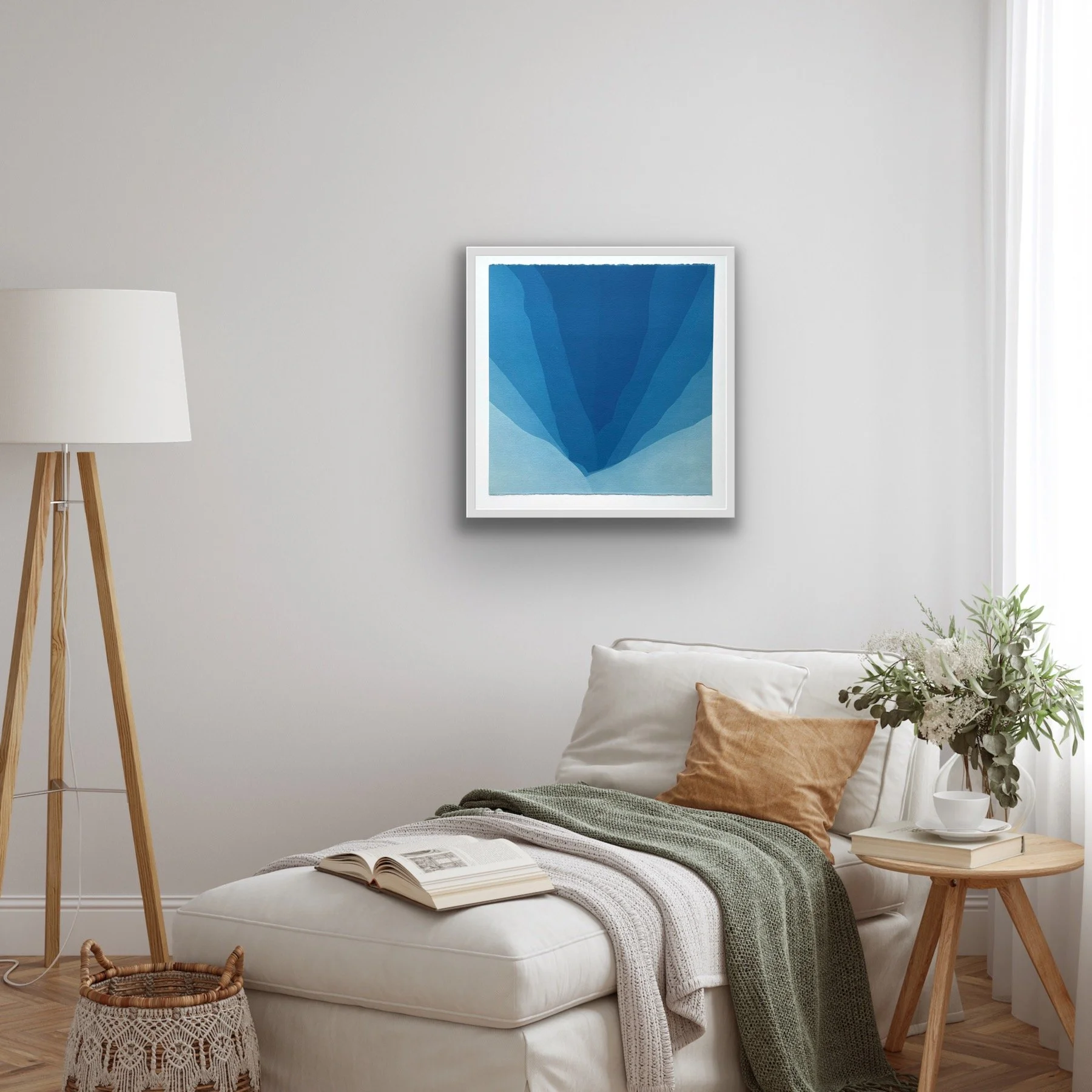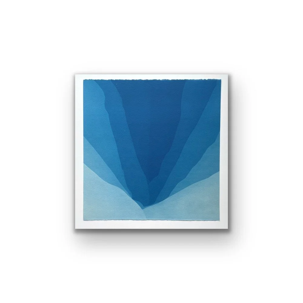 A traditional single-exposure cyanotype yields a white silhouette against a dark blue background. But instead of creating a white image by blocking light with solid objects on the light-sensitive paper, I used water to block the light, creating subtle gradations of darkening blue as I submerged the light-sensitive paper for different carefully timed exposures under water.