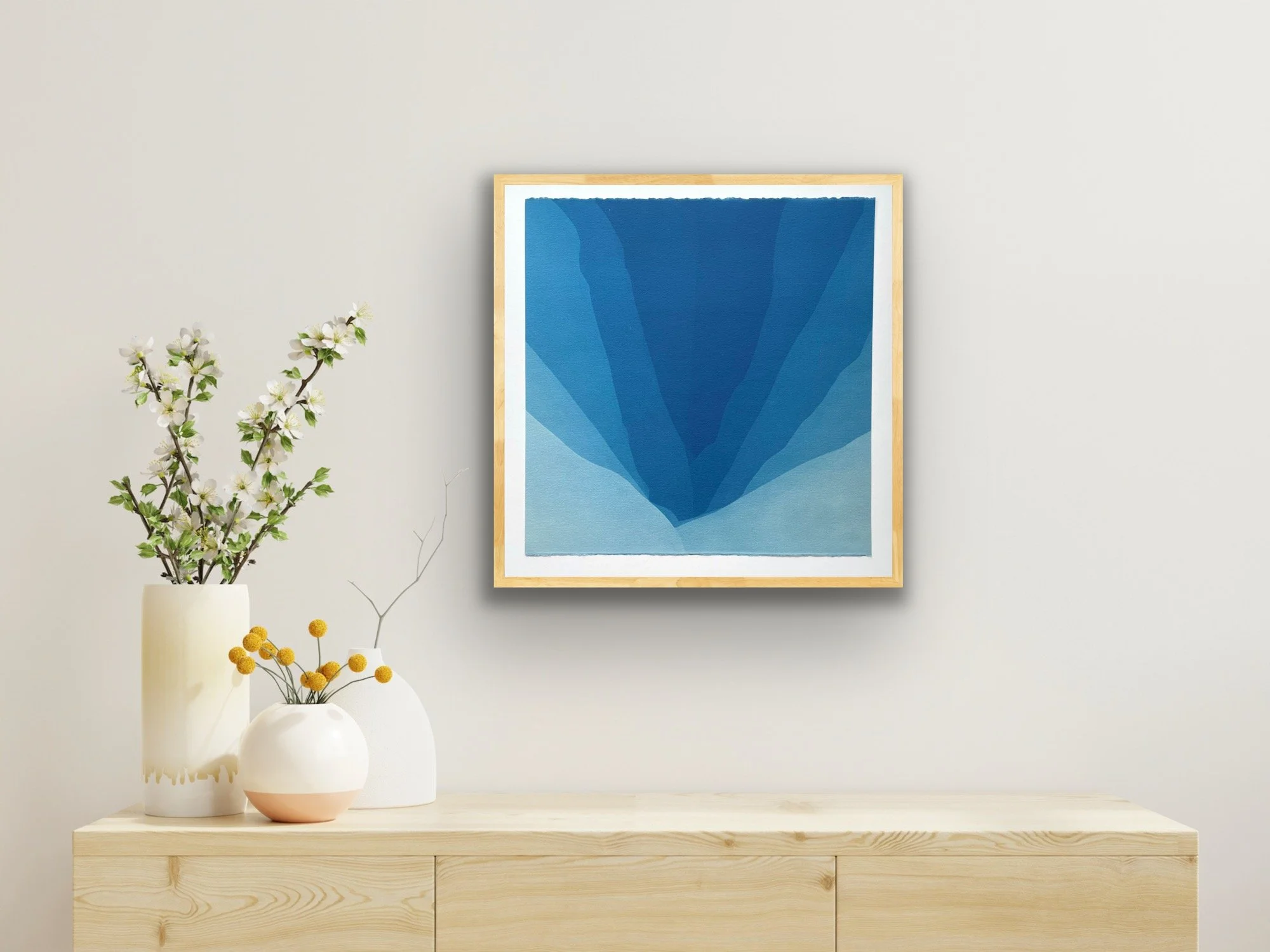 Though this monotype resembles a watercolor painting or an aquatint etching, it is actually a form of photography called a cyanotype, photogram or sun print. What you see is a multiple-exposure lensless photograph. My technique is a form of experimental photography which may include tiny splashes from where water washed off the photo chemicals before it darkened and turned blue. Each abstract cyanotype is entirely unique. These exact lines, shapes and shades of blue cannot be recreated as the exposure of the paper was heavily manipulated by me during each printing.