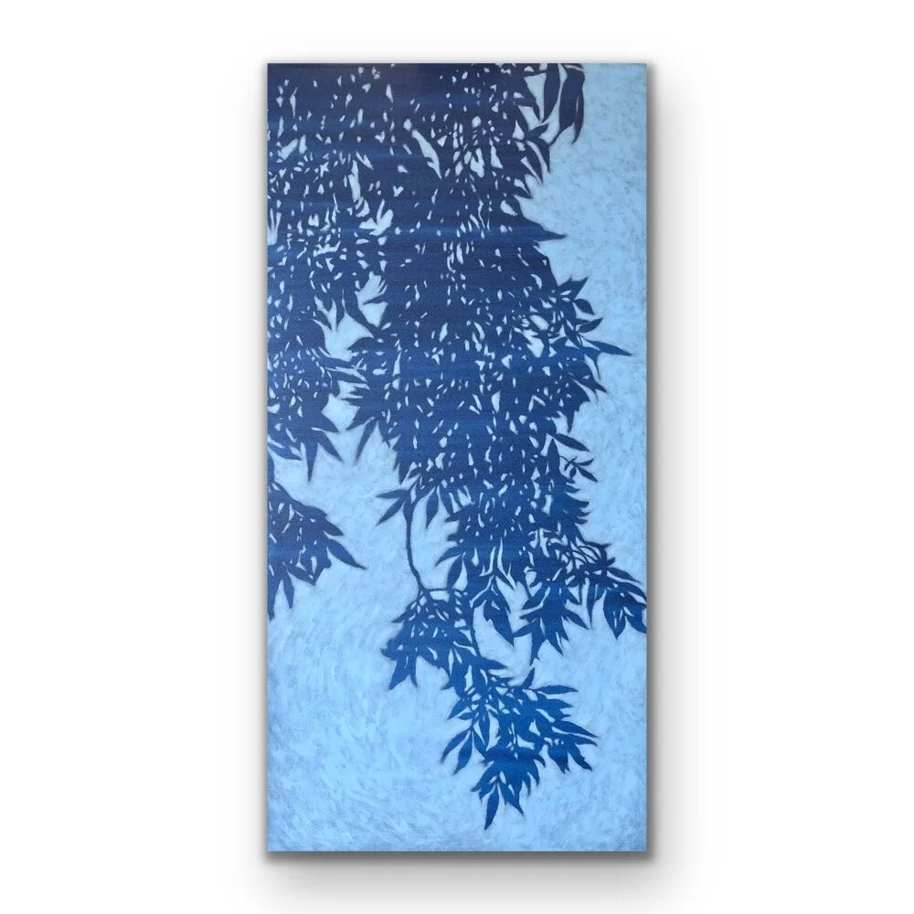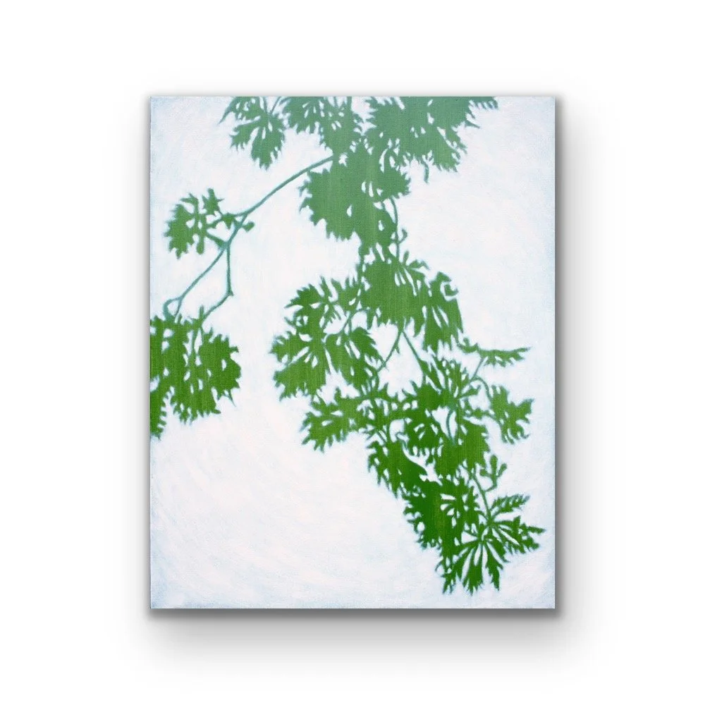 The darker green leaves are painted twice, the second time thinly with a translucent green glaze on them that makes them shine or glow. The background—the air around them — is a creamy opaque paler green, not white. Depending on your computer monitor, the background may appear white or pale gray or pale beige, but it is actually a very pale muted pistachio ice cream green.