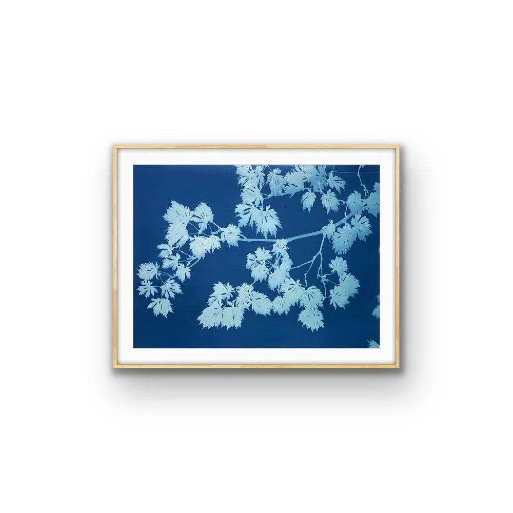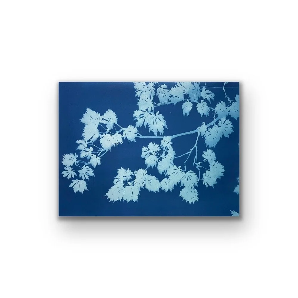 Traditional single-exposure cyanotype prints are a solid dark blue with a crisp white silhouette. My cyanotypes of varying shades of blue are triple-exposure and sometimes quadruple-exposure cyanotypes. Plant cuttings are arranged on paper previously coated with light-sensitive chemicals and then rearranged in different locations on the same paper, taking it in and out of sunlight, and then re-exposing the paper to light multiple times, creating ghostly overlapping images. The effect is like moonlight or sunlight through leaves.